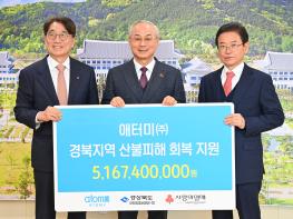 경북도는 8일 경북도청에서 ㈜애터미와 경북 산불 피해지역 복구를 위한 지정기탁금 51억 6,700만원 전달식을 가졌다.