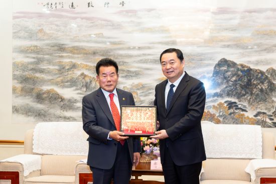 | 랴오닝성 친선교류 사진(하오펑(鵬)랴오닝성 서기 겸 인민대표대회 상무위원회 주임에게 도의회 천마총금관 선물 전달)/도의회 제공 |