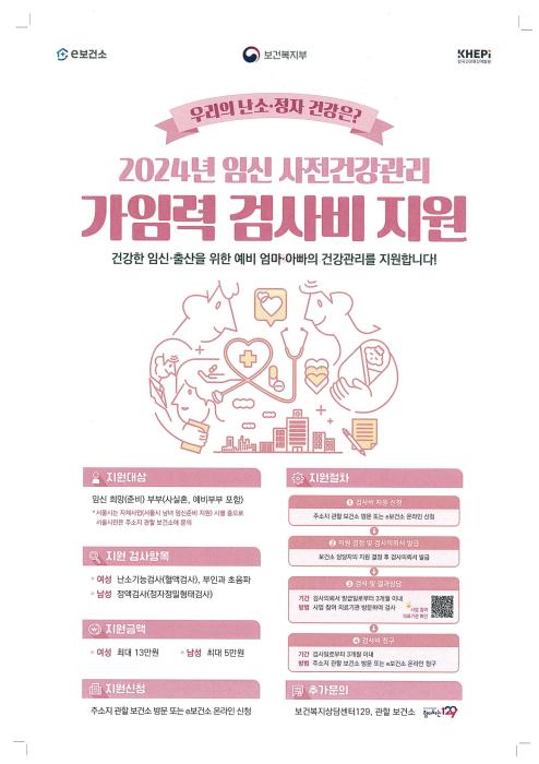 ‘임신 사전건강관리 지원사업’은 임신을 희망하는 부부(사실혼, 예비부부 포함)를 대상으로 임신․출산에 장애가 될 수 있는 건강 위험 요인을 조기에 발견할 수 있도록 필수 가임력 검사비를 지원하는 사업이다.
