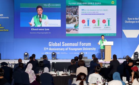 이철우 경북도지사가 28일 인터불고 호텔 컨벤션홀에서 열린 영남대학교 개교 77주년 기념 글로벌 새마을포럼(GSF)에서 ‘경북의 힘으로 새로운 글로벌 시대! - 지속 가능한 지구촌 빈곤퇴치의 희망, 경상북도의 새마을운동 세계화’를 주제로 특별 강연을 펼쳤다.