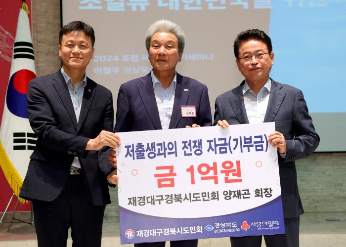 재경대구경북시도민회 양재곤 회장은 18일 서울 공군호텔에서 저출생 극복을 위한 성금 1억원을 경상북도에 전달했다.