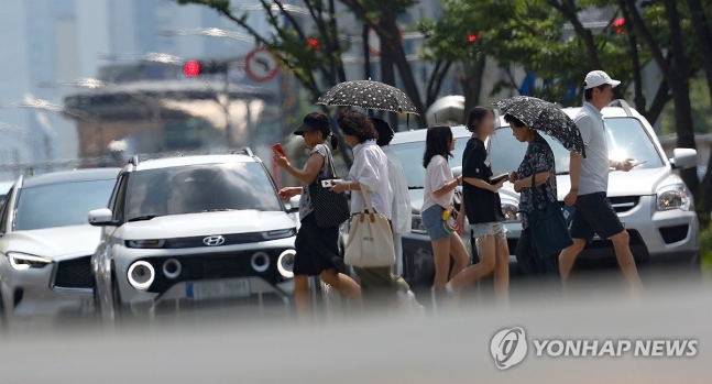 무더위가 이어진 지난 5일 대구 중구 반월당사거리 인근 달구벌대로에서 시민들이 열기로 가득한 횡단보도를 건너고 있다.연합뉴스