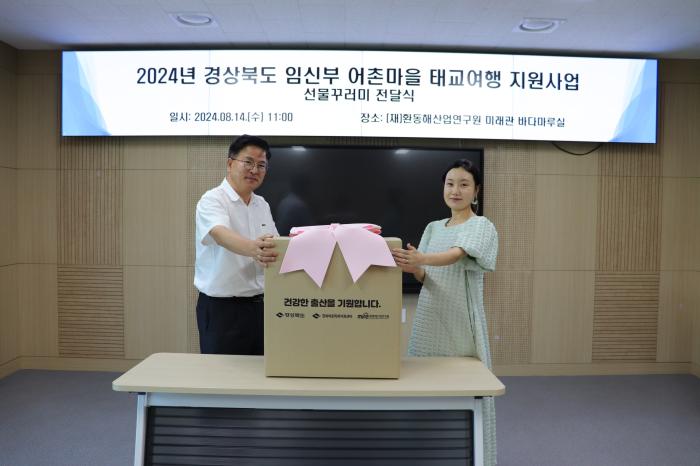 경북도는 14일 울진에 있는 경북어촌특화지원센터에서 임신부 어촌마을 태교 여행 시작을 알린 1호 주인공에게 경북도 해양레저관광과장이 임신 축하와 함께 선물꾸러미를 직접 전달했다.