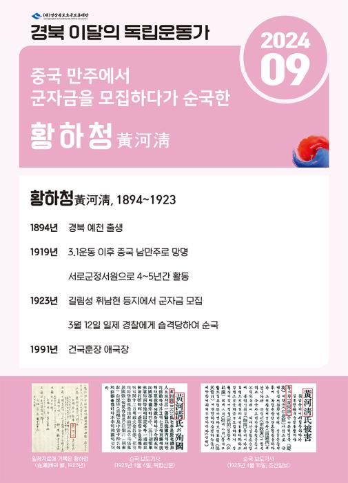 이번 경북 9월의 독립운동가로 선정된 황하청(黃河淸, 1894~1923) 선생은 예천 출신으로 1919년 만주로 망명하여 서로군정서에 들어가 활동하였다.