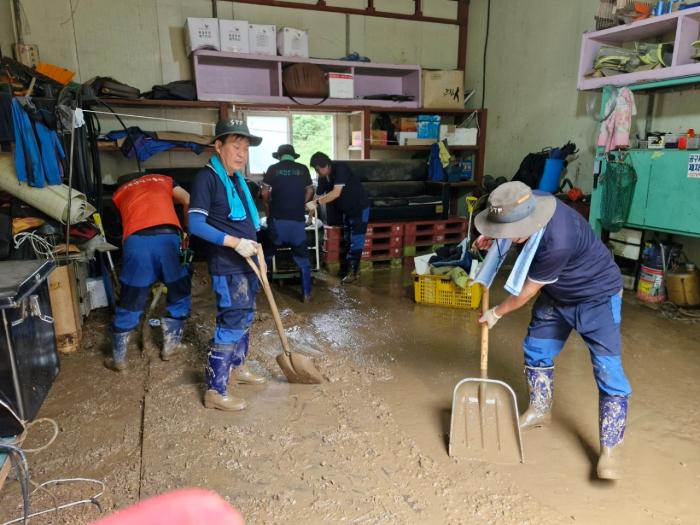 공장과 상가 산비탈 위 마대를 쌓고 배수로 흙 막힘 제거 작업을 지원했으며 1톤 탑차, 고압세척기, 기계톱 등 자체 장비를 활용해 일반 자원봉사자들과는 다른 재난복구 전문단체로서의 역량을 발휘했다.