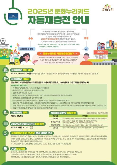 이번 문화누리카드 자동 재충전 대상은 2024년 발급 후 사용 이력이 있고, 2025년에도 자격을 유지하는 도민이 대상이다.