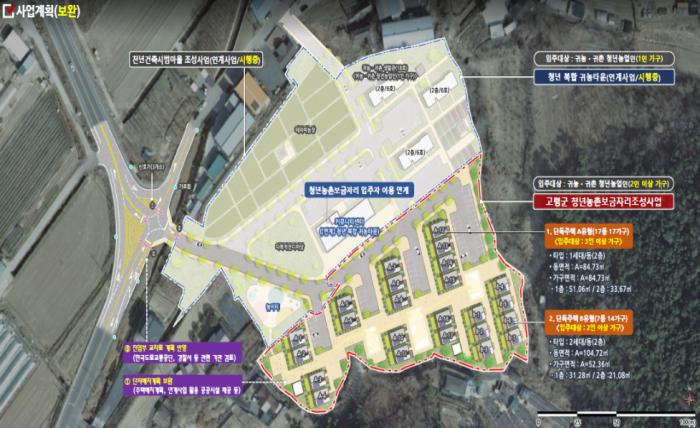 청년농촌보금자리조성사업은 귀농·귀촌 등 농촌 청년 가구의 주거 부담을 완화하고 청년 유입을 통해 기존 농촌 공동체에 새로운 활력 창출을 위한 복합 주거단지를 조성하는 사업이다.