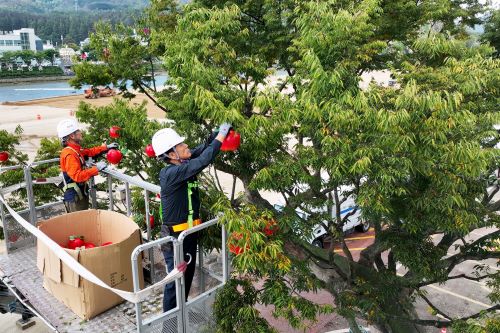 윤경희 군수가 17일, 축제장 중앙의 느티나무 앞에서 리프트기에 올라 사과 조형물을 직접 설치하고 있다./사진=청송군 제공
