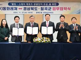 경북도는 27일 도청에서 칠곡군 기산면 일원에 1,255억원 규모의 복합레져형 관광단지 개발을 위해 ㈜동화레져, 칠곡군과 투자양해각서(MOU)를 체결했다.