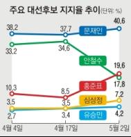 지난 2일(오전 10시~밤 10시) 여론조사 전문기관 엠브레인이 전국 성인 남녀 2058명을 대상으로 벌인 여론조사(95% 신뢰수준, 표본오차 ±2.2% 포인트)에서 문 후보는 40.6%로 선두를 내달렸다. 눈에 띄는 점은 홍 후보가 19.6%로 안 후보(17.8%)를 오차범위 안에서 앞선 것이다.