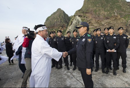 ▲장대진 의장이 독도경비대원을 격려하고 있다<사진=경북도의회 제공>