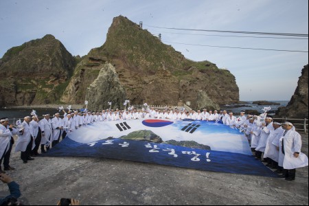 이어서, 대형 태극기를 내걸고 한복 두루마기를 입은채 결의문을 낭독하고 구호제창, 만세삼창으로 이어지는 퍼포먼스를 갖고 독도수호에 대한 의지를 새롭게 다졌다.
