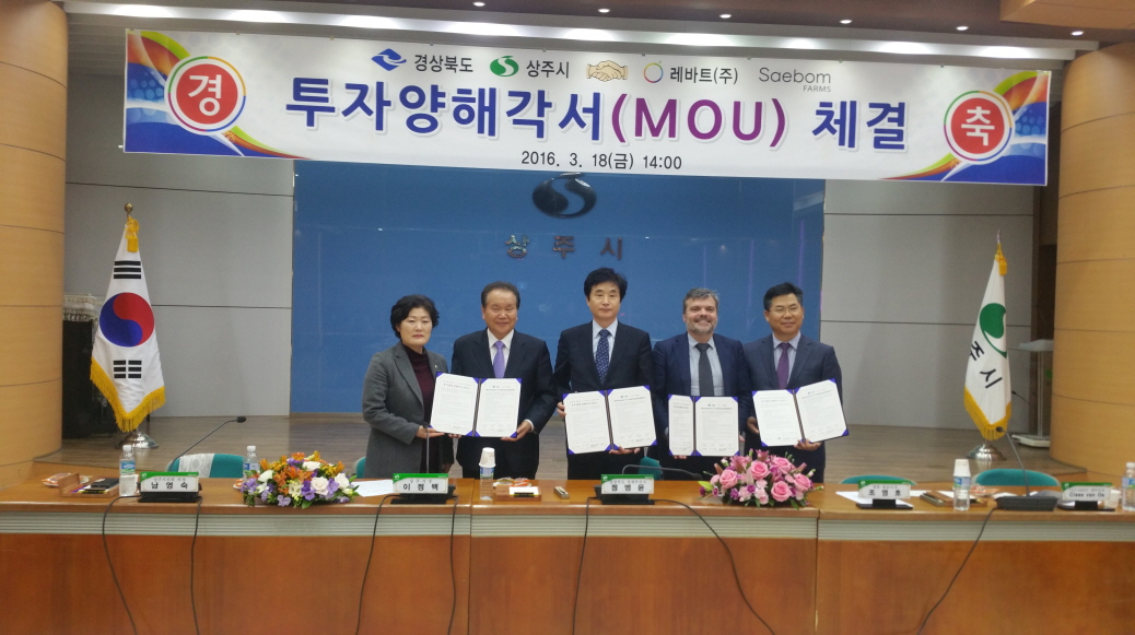 네덜란드 레바트 社 투자양해각서(왼쪽부터 남영숙 상주시 시의회의장, 이정백 상주시장, 정병윤경제부지사, 클라스반오스 에바트사 이사)