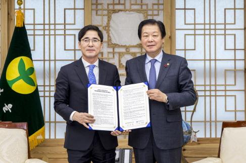 | 김장주 경북도 행정부지사(왼쪽)와 김응규 경북도의회 의장이 19일 도 산하기관장 인사검증 협약을 체결했다<사진=경북도 제공> |