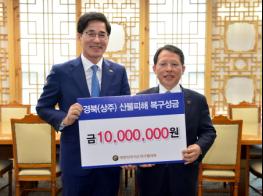 대한민국 시도지사협의회(회장 최문순)는 지난 5월 6일 상주시 사벌면에서 발생한 화재로 피해를 입은 주민들과 함께 아픔을 나누고 재해 복구에 힘을 보태기 위해 16일 오후 화재피해 성금 1천만원을 경북도(행정부지사 김장주)에 전달했다.