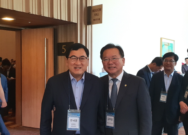 주낙영 경주시장 당선자가 27일 민선 7기 지방자치단체장 비전포럼에서 김부겸 행안부장관과 면담 후 기념사진을 찍고 있다<사진=경주시 제공>
