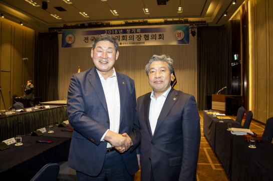 장경식 경북도의회의장(협의회 수석 부회장. 왼쪽)은 협의회 회장으로 선출된 경기도의회 송한준 의장과 함께 협의회를 1년간 이끌게 된다<사진=경북도의회 제공>