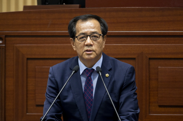 경북도의회 박승직 의원이 5분자유발언을 통해 도청 신도시 2단계 사업의 문제점을 조목조목 지적하고 소외된 동남권 균형발전을 촉구하고 있다<사진=경북도의회 제공>