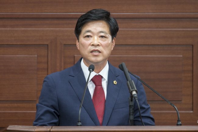 경북도의회 이춘우 의원이 12일 제303회 임시회 제3차 도정질문을 통해 영천경마공원의 후속 대책을 촉구하고 있다<사진=경북도의회 제공>