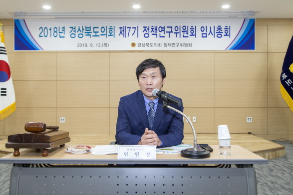 신임 조현일 제7기 정책연구위원회 위원장이 정책연구위원회 임시총회를 주재하고 있다<사진=경북도의회 제공>