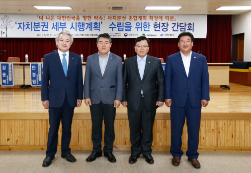 경북도의회는 11월 2일 대구시청 대회의실에서 대통령소속 자치분권위원회의 자치분권자치분권종합계획 발표에 따른 후속조치로 개최된 자치분권 시행계획 수립을 위한 현장간담회에 참석하여 종합계획의 주요 내용을 청취하고 자치분권을 위한 문제점과 대안을 적극 제시했다.
