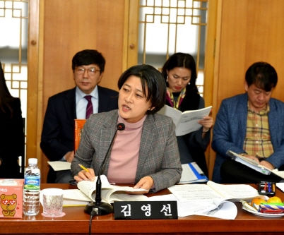 김영선 도의원은 민주평통 대행기관 운영에 관한 조례를 발의하고 성인지 예결산제도 운영의 실효성에 대한 의문을 제기하는 한편 비현실적인 스마트팜 혁신벨리 사업 문제도 지적했다. 또 최근 경북도의 관리 운영문제가 불거진 경북체육회 ‘팀킴’의 부실감독과 논란이 되고 있는 김모 감독을 컬링협회 이사로 선임한 점을 강력히 질타했다.