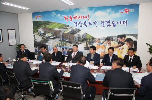 장경식 경북도의회 의장과 한창화, 김희수, 이칠구, 박용선, 김종영, 이재도, 김상헌 의원 등 포항지역 도의원이 6일 경북도 환동해지역본부를 방문, 용흥중학교 임시청사 이전 추진상황을 점검하고 있다<사진=경북도의회 제공>