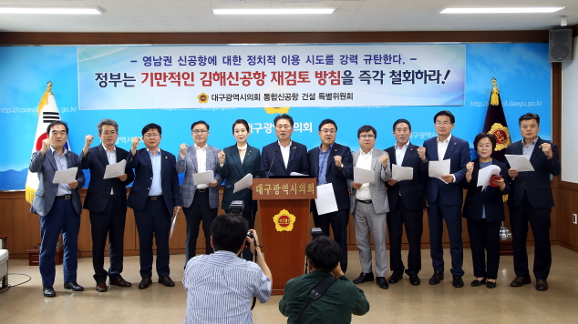 대구시의회 통합신공항 건설 특별위원회(위원장 홍인표)는 25일 대구시의회에서 통합신공항 건설 특위 위원 및 배지숙 시의회 의장을 비롯한 시의원들과 함께 '영남권 신공항에 대한 정치적 이용 규탄 성명서'을 발표했다.