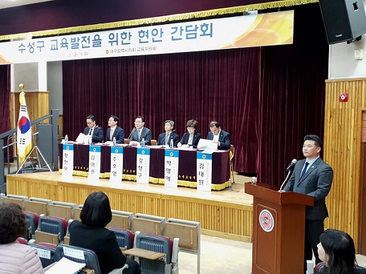 대구시의회 교육위원회는 11월 22일 오후 3시 대구수성초등학교 시청각실에서 수성구 지역 26개교 학교장, 학교 운영위원 및 학부모 등을 초청해 현장의 목소리를 청취하고 교육현안 문제 해결 및 의정활동 반영을 위한 간담회를 개최하였다.