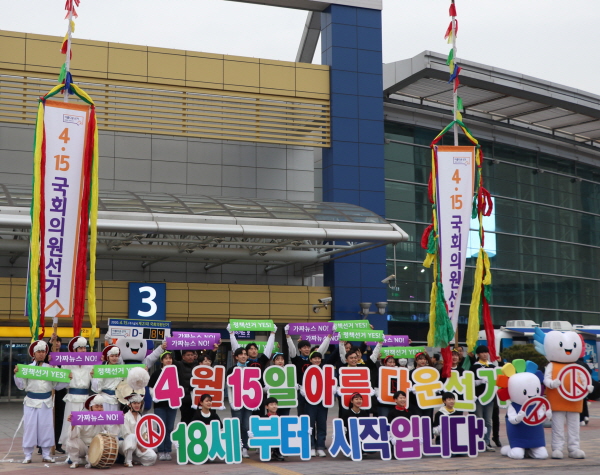 대구광역시선거관리위원회가 설 명절 연휴를 이틀 앞둔 22일, 동대구역 광장에서 귀성객을 대상으로 ‘국회의원선거 D-80, 정책선거 홍보 및 18세 유권자 응원 퍼포먼스’를 실시했다.