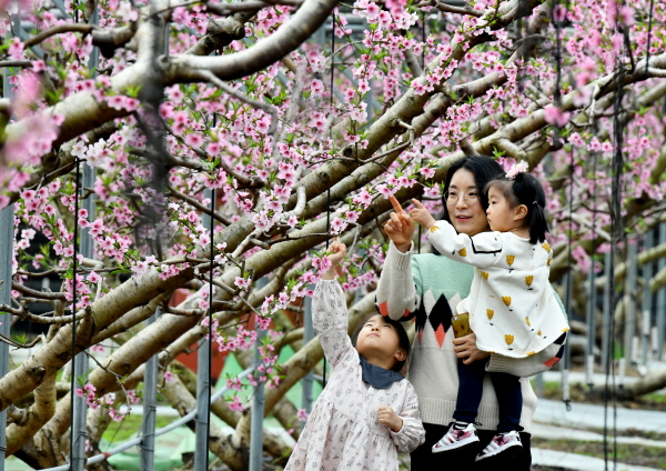 경산시 압량면에 복사꽃이 한껏 만개했다. 백안리 김운태씨의 시설하우스에 한 가족이 꽃구경을 하며 이른 봄을 마중하고 있다.