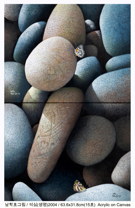 작품의 제목은 ‘Stone in heart(life)이다. 돌의 마음과 그 생명에 착안해 대상을 주관적으로 해석한 작가는 자기감정을 조약돌의 극사실적인 묘사에 투영시켰다. 조약돌에 감정을 이입한 작가는 무생물인 돌을 주관적인 시각으로 바라보며 생명을 불어넣는다. 그의 돌은 생명을 부여받고 숨을 쉰다. 보일 듯 말 듯 작으면서도 세밀하게 그려놓은 나비가 그 의미를 더욱 강화시킨다.