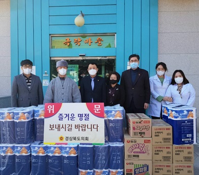 경북도의회 도기욱 부의장과 안희영 의회운영위원장은 설 명절을 앞두고, 2월 8일 장애인생활이동지원센터와 극락마을 등 예천군 소재 장애인복지시설을 방문하여 위문품을 전달하고 따뜻한 이웃사랑을 실천했다.