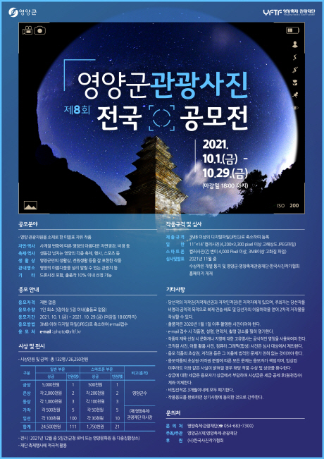 오는 10월 1일부터 10월 29일까지 (재)영양축제관광재단 이메일을 통한 작품 접수와 11월 심사를 거쳐 총 132점(일반 111, 스마트폰 21)을 선정할 계획이다.