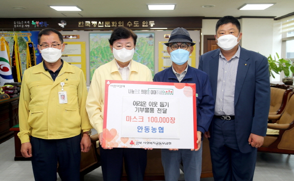 안동농협은 지난해 코로나19 발생으로 마스크 공급에 어려움이 발생하자 임직원들이 어려운 이웃과 농업인들을 위해 직접 모은 성금으로 마스크 제조기계를 구입하였고 지역사회에 마스크를 꾸준히 공급하면서 큰 보탬이 되고 있다.