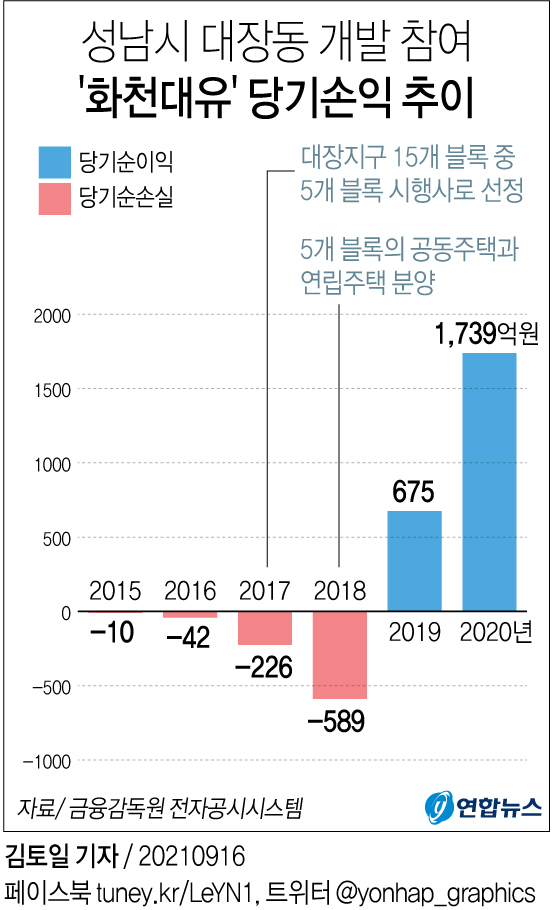 | [그래픽] 성남시 대장동 개발 참여 '화천대유' 당기손익 추이 |