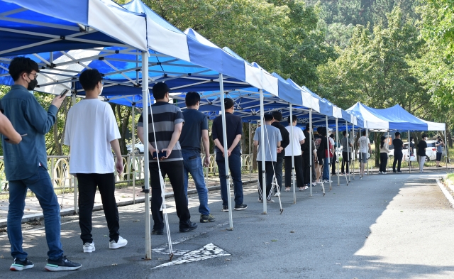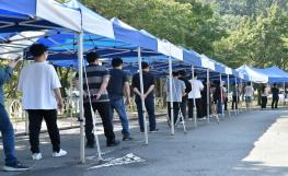 추석 연휴 마지막 날인 22일 오전 대구 수성구 대구스타디움 제3주차장에 마련된 임시선별검사소에서 시민들이 코로나19 진단검사를 받기 위해 순서를 기다리고 있다. 뉴시스