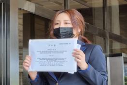 30일 오후 서울중앙지검에 국민의힘 권성동, 김기현, 윤한홍, 이영, 장제원, 최형두 의원을 공직선거법 위반 등의 혐의로 고소한 조성은 씨가 고발장을 들어 보이고 있다. 연합뉴스