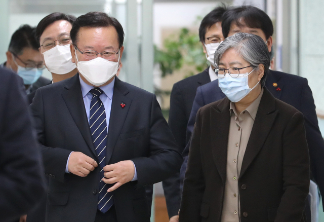 | 김부겸 국무총리가 7일 오후 신종 코로나바이러스 감염증(코로나19)의 새로운 변이 바이러스인 '오미크론 변이' 대응 간담회를 위해 충북 청주시 질병관리청을 방문, 정은경 질병관리청장(오른쪽)과 대화하며 이동하고 있다 연합뉴스 |