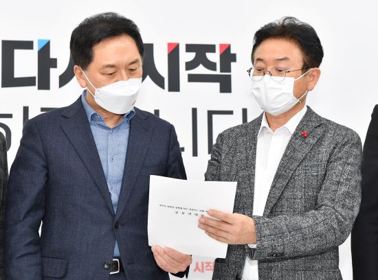 | 이철우 경북도지사가 김기현 국민의 힘 원내대표(왼쪽)괴 면담하고 탈원전정책 피해지역 보상대책마련 공동건의문을 전달하고 있다/사진=경북도 제공 |