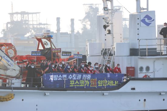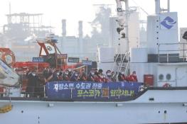 포항시 어업인들이 24일 포스코 지주사 서울 설치 및 미래기술연구원 수도권 설치를 반대하는 해상항의에 나섰다.