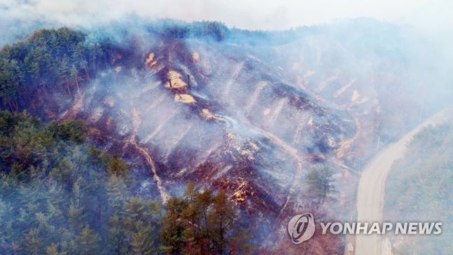 잿더미로 변한 울진군 북면 야산-5일 오전 산불이 지나가 경북 울진군 북면 하당리의 한 야산이 잿더미로 변해 있다. 연합뉴스 |