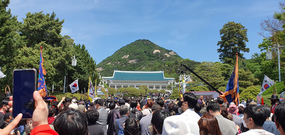 청와대 개방은 국회에서 진행된 윤석열 대통령 취임사가 끝나는 11시 30분 이후로 예정돼 있었지만 많은 시민이 이른 시간부터 모여들어 북새통을 이뤘다.