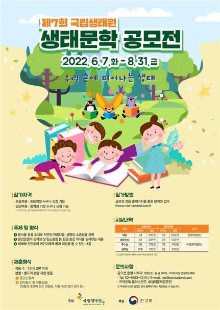 환경부 산하 국립생태원(원장 조도순)은 생태와 환경에 대한 이해와 생태적 감수성 함양을 위해 ‘제7회 국립생태원 생태문학 공모전’을 개최하고 7일부터 8월 31일까지 작품을 받는다.