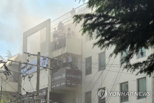 | 9일 대구 수성구 범어동 대구지방법원 인근 변호사 사무실 빌딩에서 불이나 시민들이 옥상 부근에서 구조를 기다리고 있다. 이 화재로 7명이 숨지고 46명이 다쳤다. 연합뉴스 |