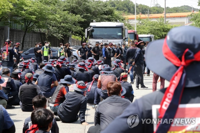 이 과정에서 조합원 6명이 화물차량 운송을 방해한 혐의로 경찰에 현행범으로 체포됐고, 경찰관 2명이 다쳐 인근 병원에서 치료를 받고 있다.