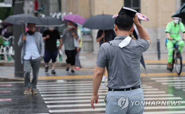 이번 주 내내 장맛비가 내릴 것으로 예보된 27일 오후 서울 시내의 거리에 비가 내리고 있다. 연합뉴스