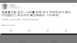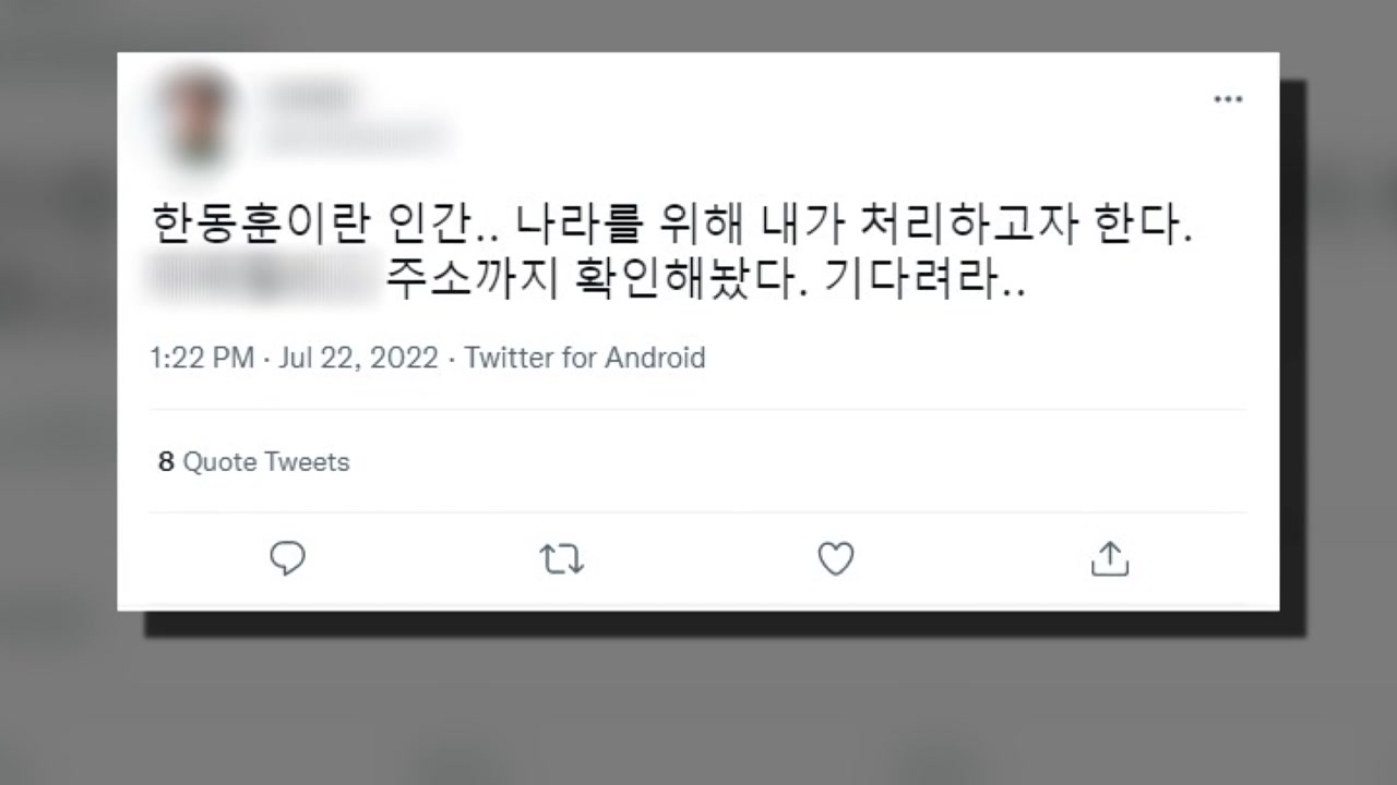충남 아산경찰서는 22일 밤 10시 반쯤 트위터에 "나라를 위해 한 장관을 처리하겠다"며 "주소까지 확인했으니 기다리라"는 내용의 글을 작성한 40대 남성 A 씨를 상대로 조사했다.