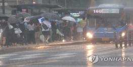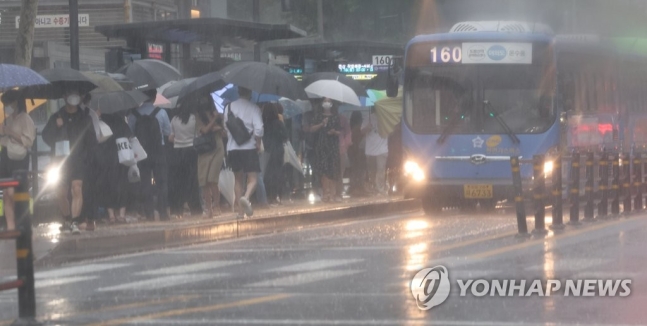 | 정류장에서 시민들이 비를 피하며 버스를 기다리고 있다. /연합뉴스 |