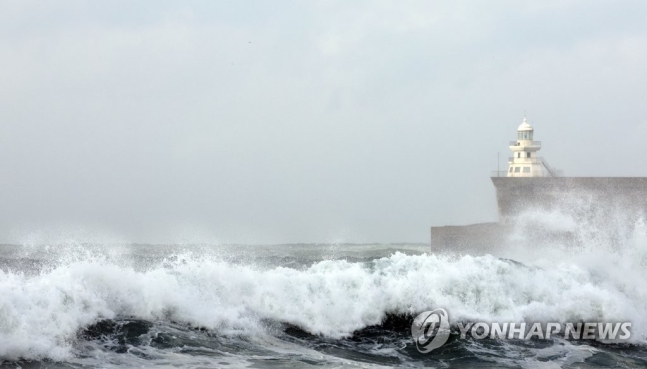 태풍 힌남노가 한반도를 향해 북상 중인 4일 제주도 서귀포 해안에 파도가 치고 있다. 기상청은 4일부터 6일까지 제주에 100∼600㎜ 이상의 비가 더 내리겠다고 예보했다/연합뉴스 |